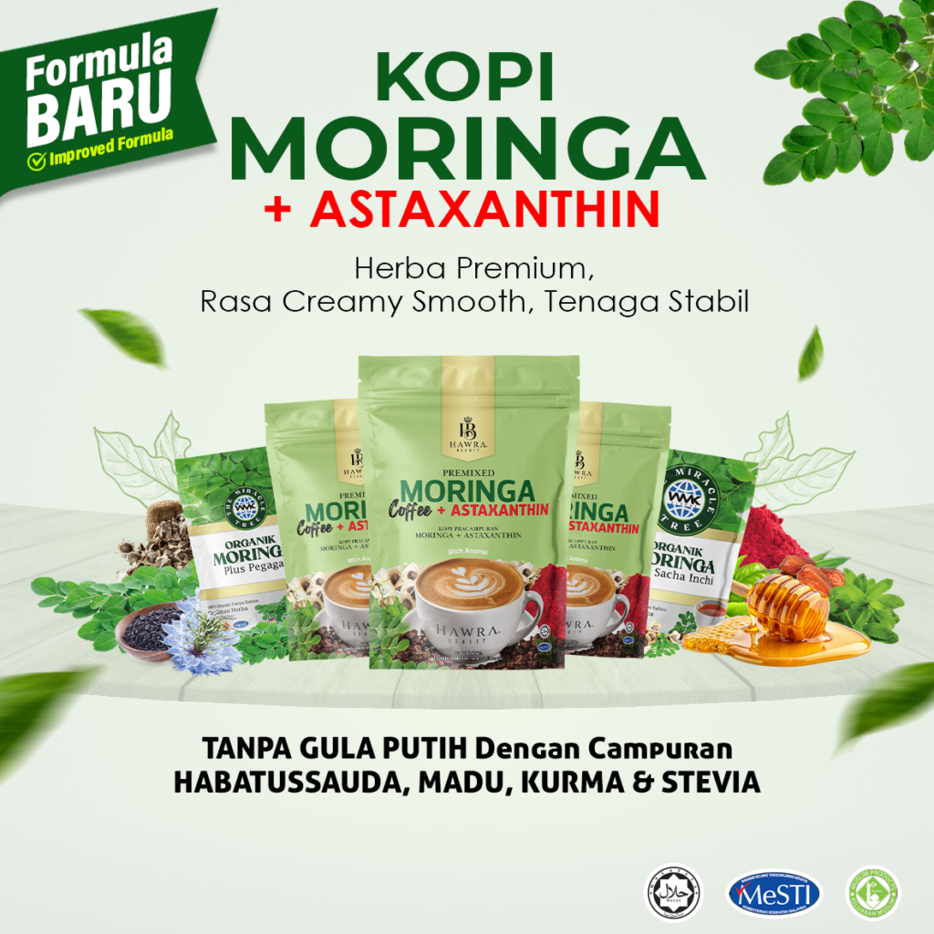 Kopi Moringa + Astaxanthin diformulasikan menggunakan gabungan kopi terpilih bersama bahan semula jadi seperti Habbatus Sauda, Madu, Kurma dan Stevia, tanpa gula tambahan.