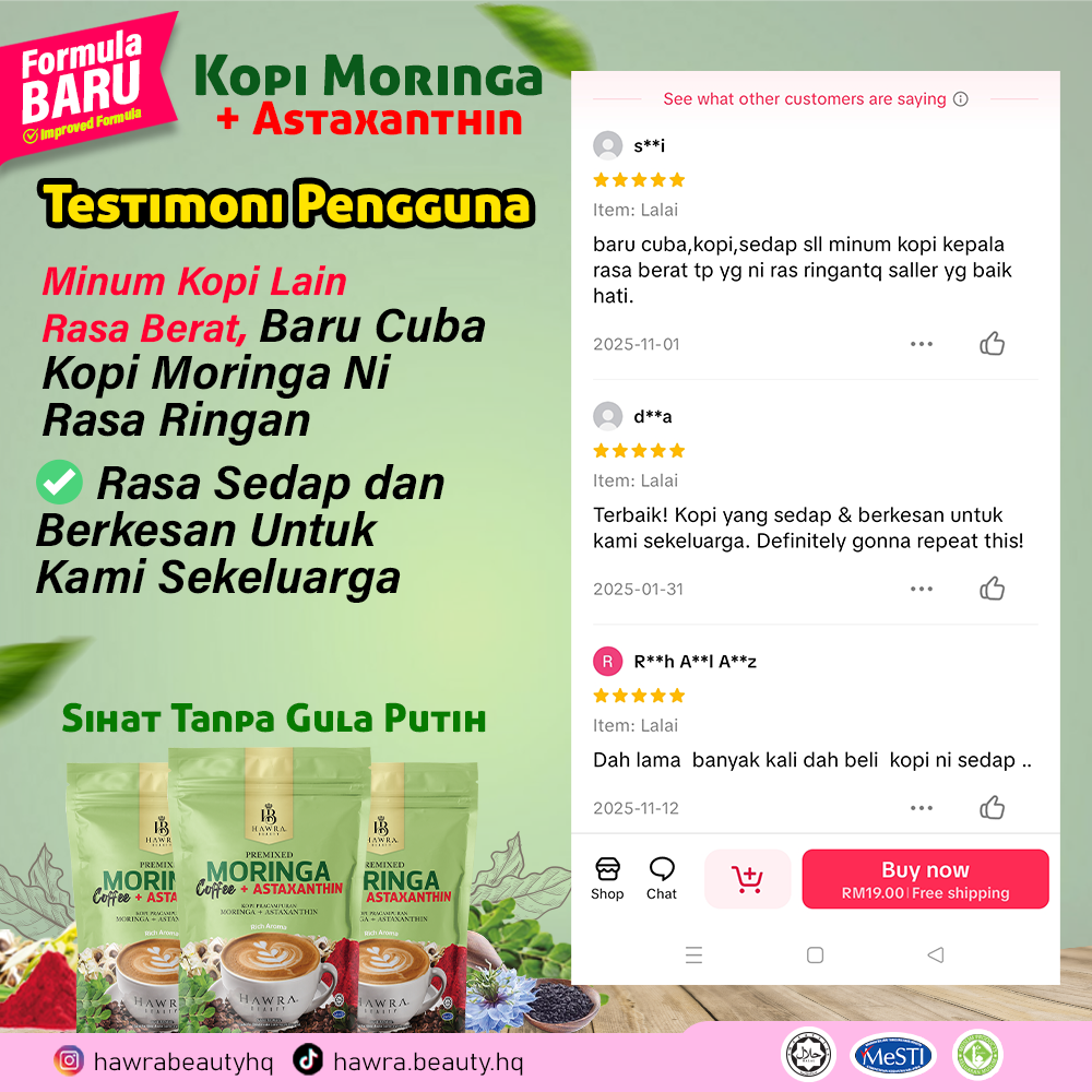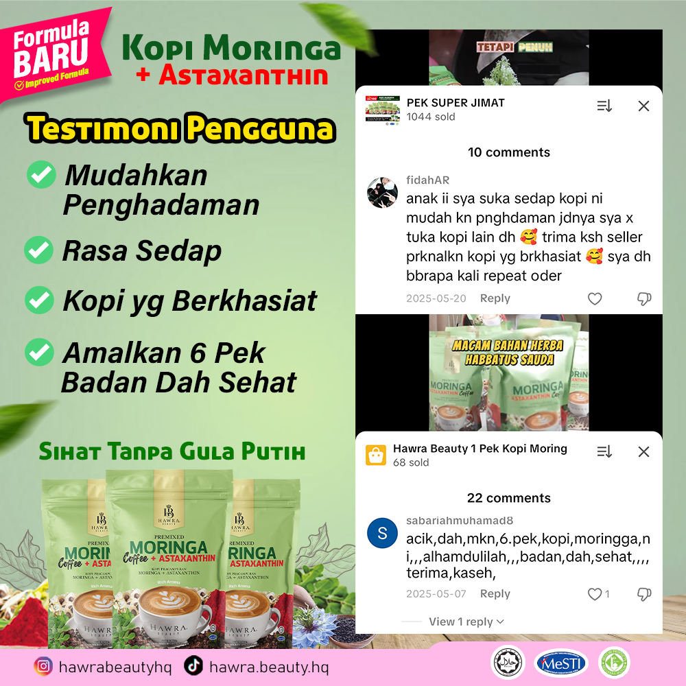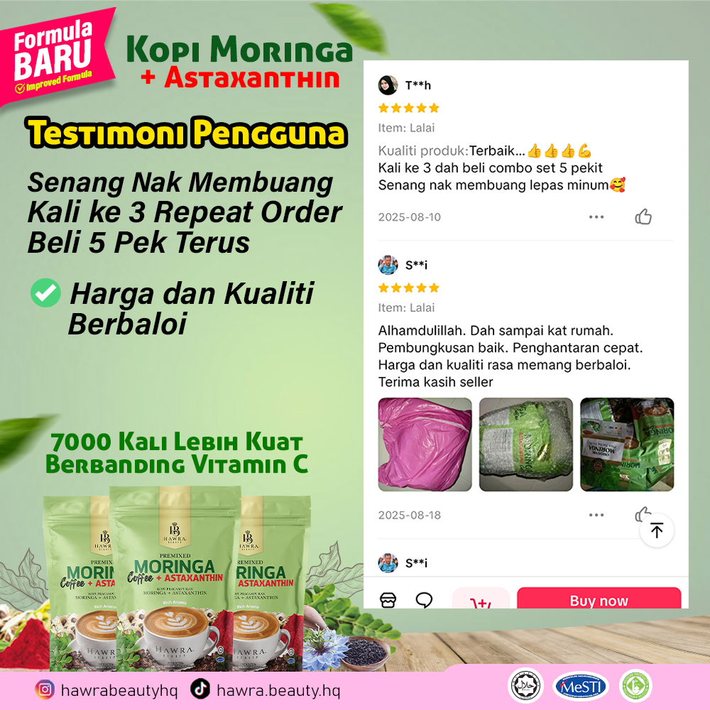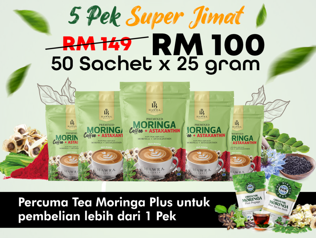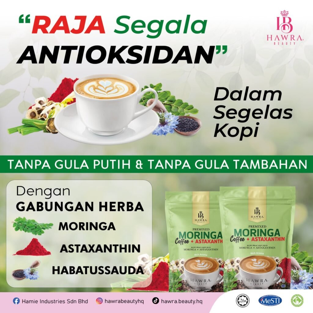 Kopi Moringa + Astaxanthin Hawra Beauty diformulasikan khas oleh pakar dengan sukatan seimbang dan tepat untuk mengoptimumkan keberkesanan antioksidan, menyokong kesihatan dalaman, tenaga harian dan perlindungan tubuh secara menyeluruh, menggunakan bahan-bahan premium dan berkualiti tinggi.”