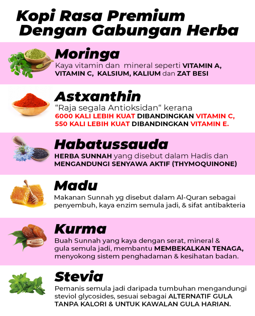Kopi Tanpa Gula PERTAMA di Malaysia yang menggabungkan Herba Antioksidan Terkuat di Dunia bersama Herba Sunnah & Herba Tradisional.